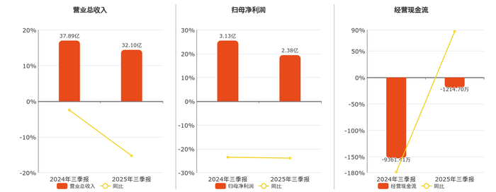 公司营业总收入为32.10亿元,在已披露的同业公司中排名第12,较去年同报告期营业总收入减少5.79亿元,同比较去年同期下降15.28%。归母净利润为2.38亿元,在已披露的同业公司中排名第14,较去年同报告期归母净利润减少7485.81万元,同比较去年同期下降23.91%。经营活动现金净流入为-1214.70万元,在已披露的同业公司中排名第18,较去年同报告期经营活动现金净流入增加8146.71万元。