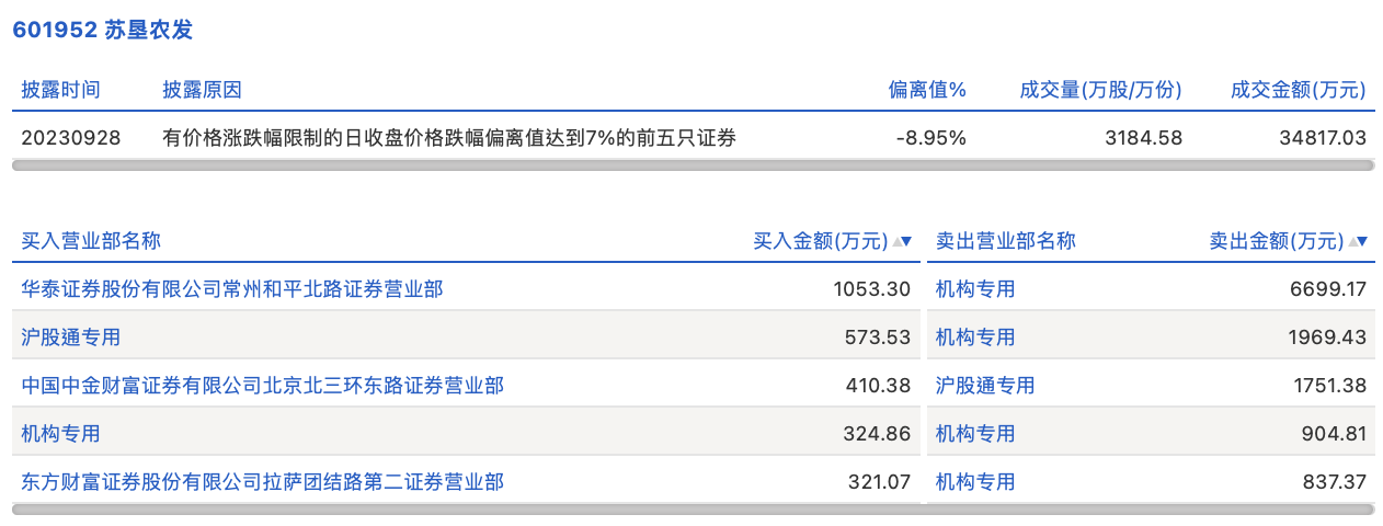 9月28日,苏垦农发今日跌8.85%,全天换手率达2.31%,振幅达9.79%。龙虎榜数据显示,营业部席位合计净卖出9479.02万元。其中,机构买入324.86万元,卖出1.04亿元,合计净卖出1.01亿元。此外,沪股通专用分别卖出1751.38万元;华泰证券常州和平北路证券营业部、沪股通专用分别买入1053.30万元、573.53万元。