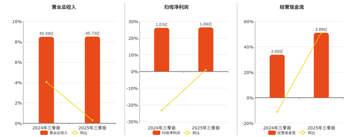 公司营业总收入为45.73亿元。归母净利润为1.04亿元。经营活动现金净流入为3.09亿元。