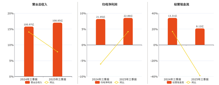 公司营业总收入为108.85亿元,在已披露的同业公司中排名第5,较去年同报告期营业总收入增加7.88亿元,实现5年连续上涨,同比较去年同期上涨7.80%。归母净利润为22.86亿元,在已披露的同业公司中排名第1,较去年同报告期归母净利润增加9148.97万元,同比较去年同期上涨4.17%。经营活动现金净流入为8.12亿元,在已披露的同业公司中排名第4。