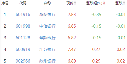 浙商银行、中信银行、常熟银行、江苏银行和苏州银行位列涨幅榜后五位,涨幅分别为-0.35%、-0.15%、-0.15%、0.27%和0.29%。