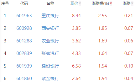 其中,重庆银行、西安银行、农业银行、张家港行、建设银行和紫金银行位列板块涨幅前五位,涨幅分别为2.55%、1.85%、1.69%、1.64%、1.54%和1.54%。