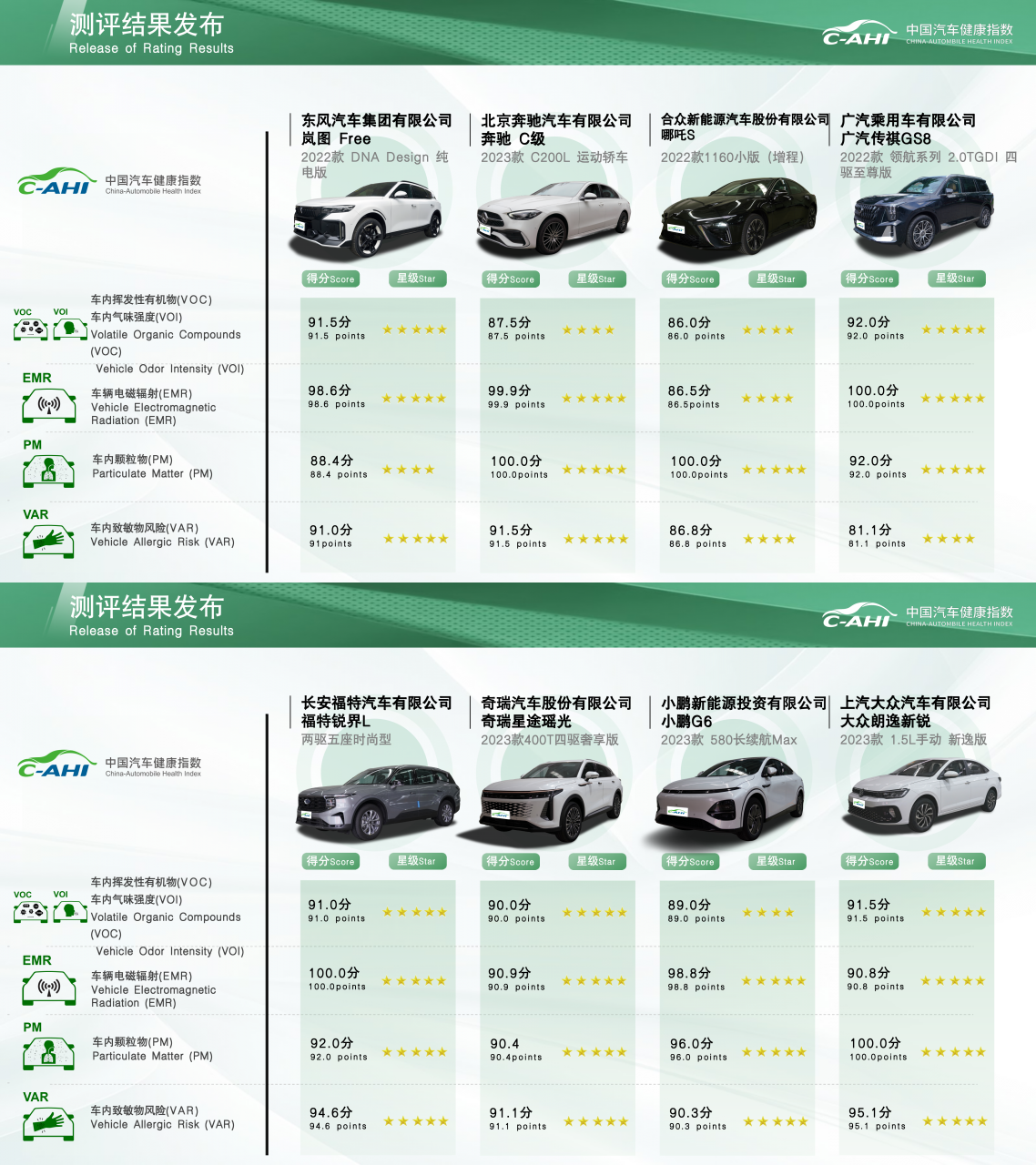 本次发布的C-AHI中国汽车健康指数2023年第五批次测评结果涵盖了岚图 Free(2022款 DNA Design 纯电版)、奔驰 C级(2023款 C200L 运动轿车 )、哪吒S(2022款1160小版(增程))、广汽传祺GS8(2022款 领航系列 2.0TGDI 四驱至尊版)、福特锐界L(两驱五座时尚型)、奇瑞星途瑶光(2023款400T四驱奢享版)、小鹏G6(2023款 580长续航Max)、大众朗逸新锐(2023款 1.5L手动 新逸版)8款车型,发布包括了车内挥发性有机化合物与车内气味强度(VOC&VOI)、车辆电磁辐射(EMR)、车内颗粒物(PM)、车内致敏风险(VAR)四个板块的测评结果。