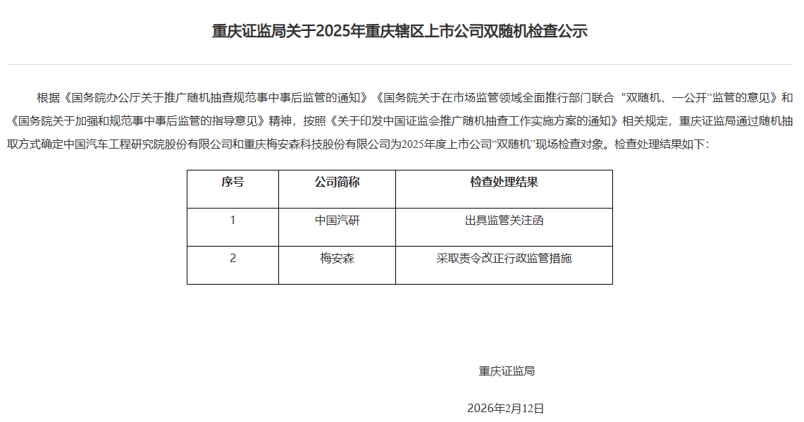 2月24日,重庆证监局发布2025年重庆辖区上市公司双随机检查公示,重庆证监局通过随机抽取方式确定中国汽研(601965.SH)和梅安森(300275.SZ)为2025年度上市公司“双随机”现场检查对象。