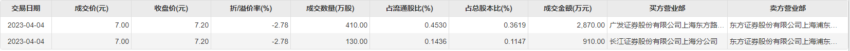 4月4日大宗交易成交540万股,成交额3780万元,占当日总成交额的52.58%,成交价7元,较市场收盘价7.2元折价2.78%。