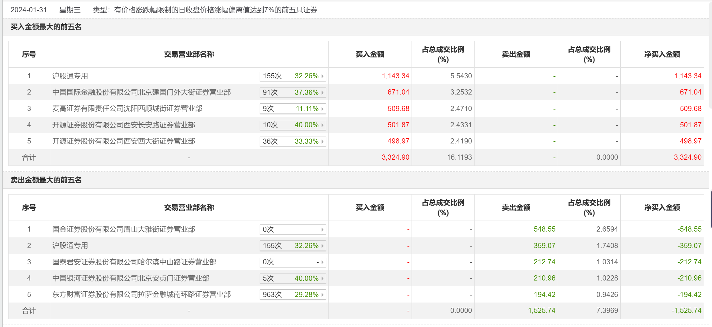 1月31日,宝钢包装今日涨停,全天换手率达4.22%,振幅达9.11%。龙虎榜数据显示,营业部席位合计净买入1799.16万元。其中,沪股通专用、中国国际金融北京建国门外大街证券营业部分别买入1143.34万元、671.04万元;国金证券眉山大雅街证券营业部、沪股通专用分别卖出548.55万元、359.07万元。