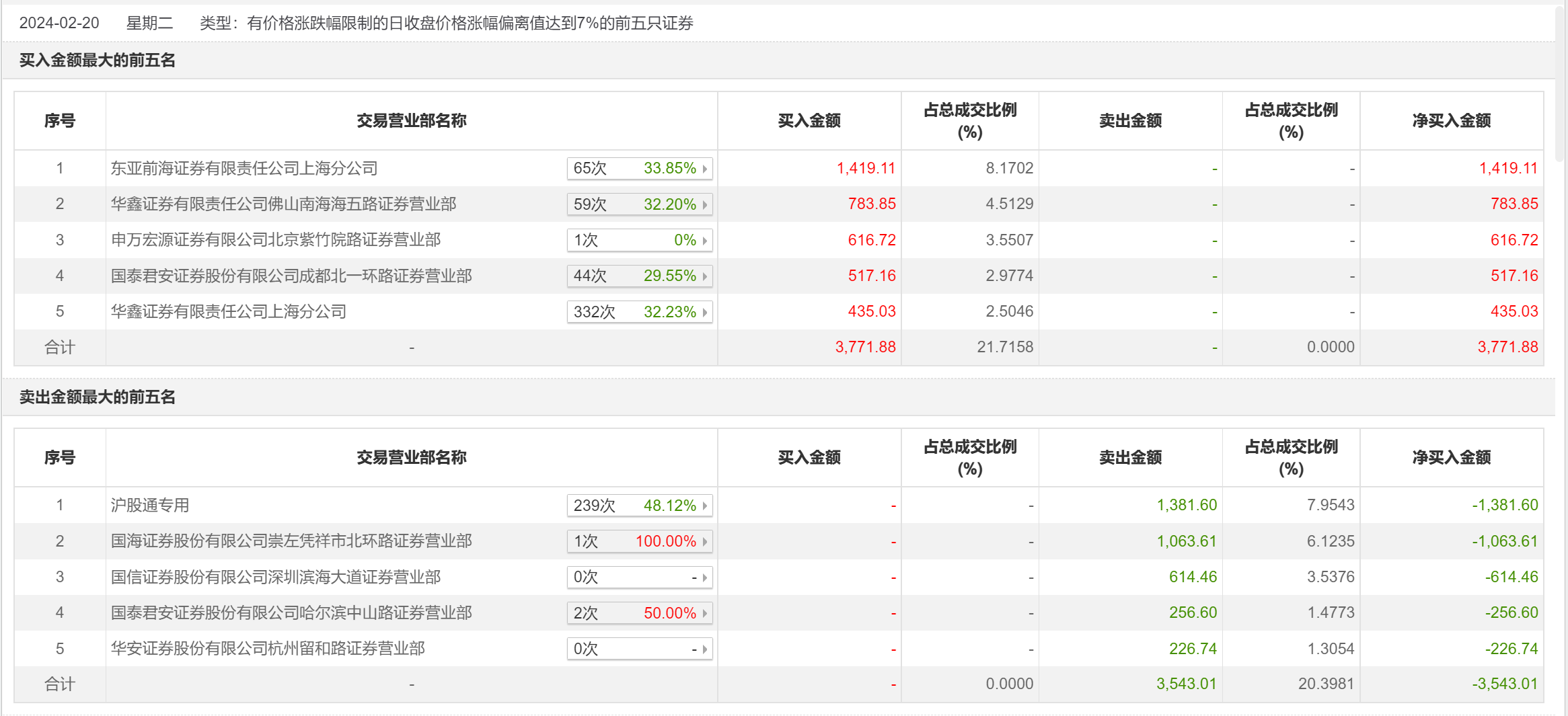 具体来看,东亚前海证券上海分公司、华鑫证券佛山南海海五路证券营业部分别买入1419.11万元、783.85万元;沪股通专用、国海证券崇左凭祥市北环路证券营业部分别卖出1381.60万元、1063.61万元。