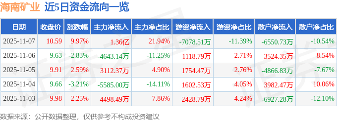 证券之星消息,海南矿业11月7日涨停收盘,收盘价10.59元。该股于9点58分涨停,未打开涨停,截止收盘封单资金为1.09亿元,占其流通市值0.52%。