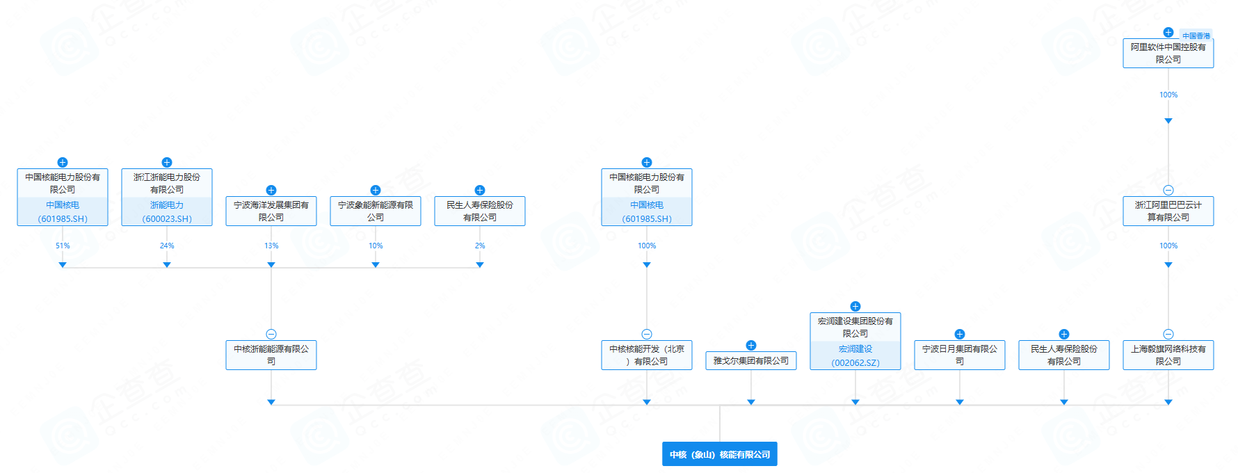 股东信息显示,该公司由中国核电(601985.SH)旗下中核浙能能源有限公司、宏润建设(002062.SZ)、雅戈尔集团有限公司、阿里巴巴旗下上海毅旗网络科技有限公司等共同持股。
