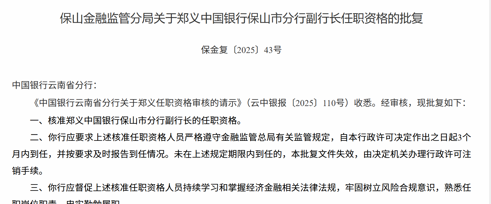 保山市分行副行长任职资格的批复,核准郑义中国银行保山市分行副行长的任职资格。