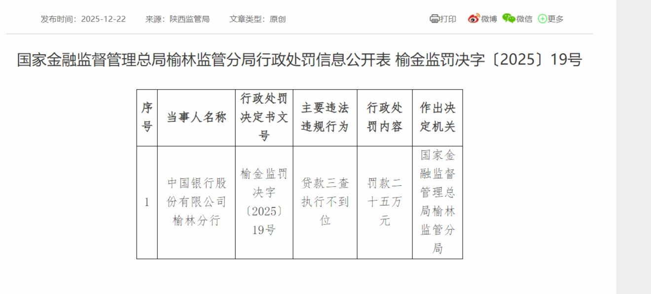 贷款三查执行不到位,中国银行榆林分行被罚款25万元