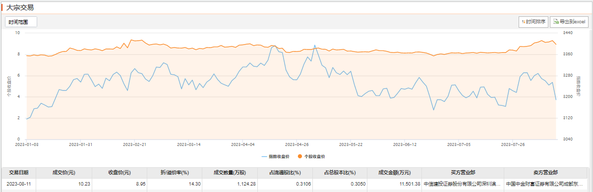 今日大宗交易成交1124.28万股,成交额1.15亿元,占当日总成交额的14.9%,成交价10.23元,较市场收盘价溢价14.3%。