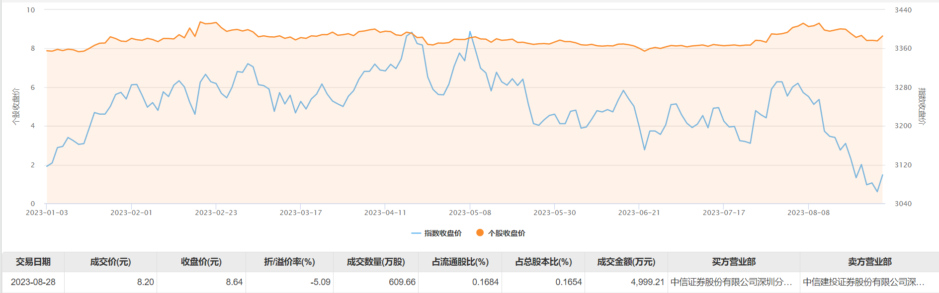 8月28日大宗交易成交609.66万股,成交额4999.21万元,占当日总成交额的4.49%,成交价8.2元,较市场收盘价8.64元折价5.09%。