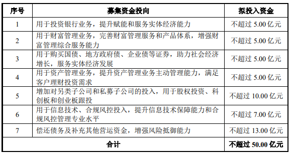 南京证券6月27日发布的《向特定对象发行A股股票募集说明书(修订稿)》显示,公司本次向特定对象发行A股股票募集资金总额不超过50.00亿元(含本数),扣除发行费用后拟全部用于补充公司资本金,具体拟用于以下方面:用于投资银行业务,提升赋能和服务实体经济能力;用于财富管理业务,完善财富管理服务和产品体系,增强财富管理综合服务能力;用于购买国债、地方政府债、企业债等证券,助力社会经济增长,服务实体经济发展;用于资产管理业务,提升资产管理业务主动管理能力,满足客户理财投资需求;增加对另类子公司和私募子公司的投入,用于股权投资、科创板和创业板跟投;用于信息技术、合规风控投入,提升信息技术保障能力和合规风控管理专业水平;偿还债务及补充其他营运资金,增强风险抵御能力。