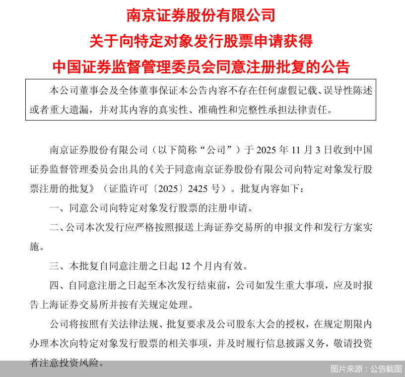 北京商报讯(记者刘宇阳)11月3日,南京证券发布公告称,公司于当日收到中国证监会出具的《关于同意南京证券股份有限公司向特定对象发行股票注册的批复》,同意南京证券向特定对象发行股票的注册申请。