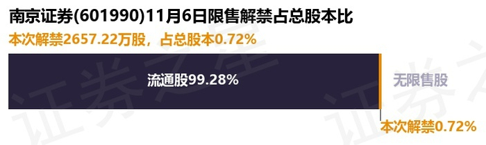 南京证券(601990)2657.22万股限售股将于11月6日解禁,占总股本0.72%