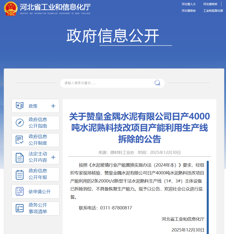 12月30日,据河北工信厅发布,按照《水泥玻璃行业产能置换实施办法(2024年本)》要求,经组织专家现场核验,赞皇金隅水泥有限公司日产4000吨水泥熟料技改项目产能利用的2条2000t/d新型干法水泥熟料生产线(1#、3#)主体设备已拆除到位,不具备恢复生产能力。现予以公告,欢迎社会公众进行监督。