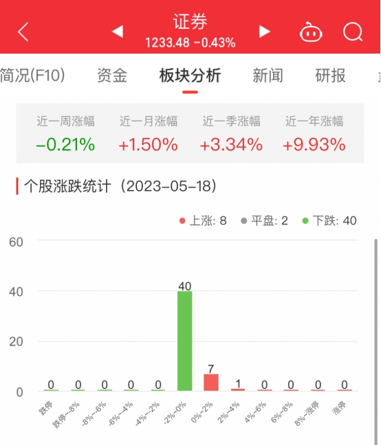 中国经济网北京5月18日讯今日,证券板块整体涨幅-0.43%,其中8只股票上涨,2只平盘,40只股票下跌。