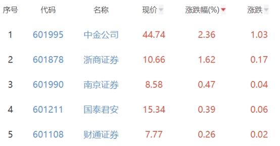 其中,中金公司、浙商证券、南京证券、国泰君安、财通证券位列板块涨幅前五位,涨幅分别为2.36%、1.62%、0.47%、0.39%、0.26%。