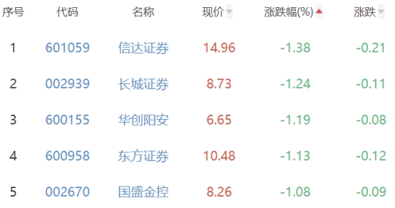 信达证券、长城证券、华创阳安、东方证券、国盛金控位列涨幅榜后五位,涨幅分别为-1.38%、-1.24%、-1.19%、-1.13%、-1.08%。