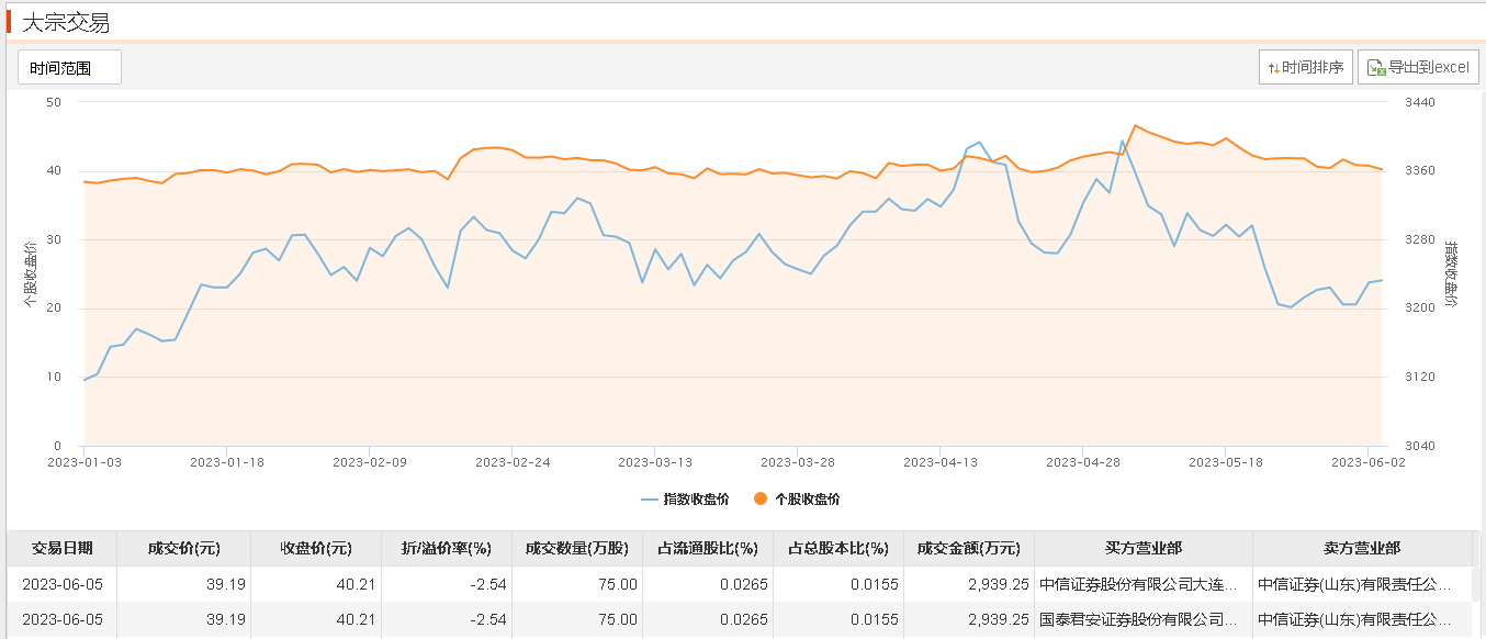 6月5日大宗交易成交150万股,成交额5878.5万元,占当日总成交额的11.28%,成交价39.19元,较市场收盘价40.21元折价2.54%。