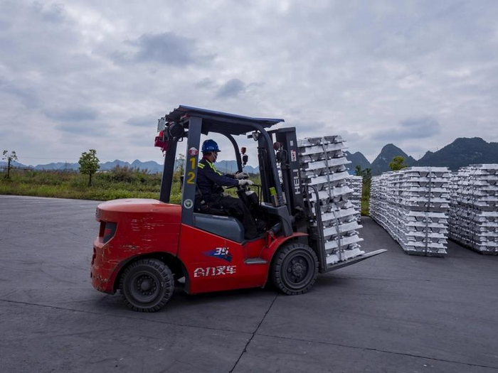 叉车司机正在转运成品的铝锭。余军摄