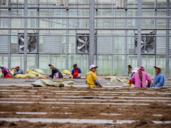 工人铺设椰糠为下一季生产做准备。余军摄