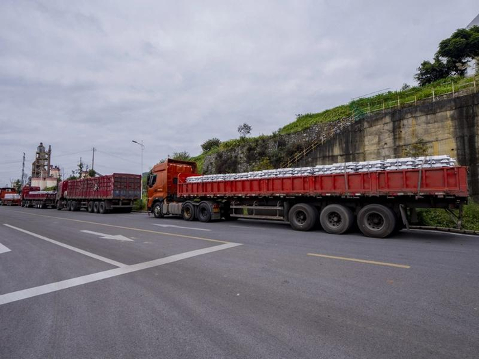 满载成品铝锭排队出厂的车队。余军摄
