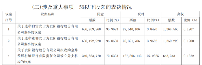 此次股东会议,关于贵阳银行拟收购息烽发展村镇银行设立分支机构的议案,反对的声音不小。尤其是中小股东,对于收购村镇银行的反对票1.27亿票,比例高达27.2325%。