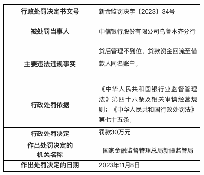 贷款资金回流至借款人同名账户,中信银行乌鲁木齐分行被罚30万