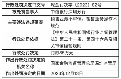 因销售业务不审慎等,中信银行深圳分行被罚85万