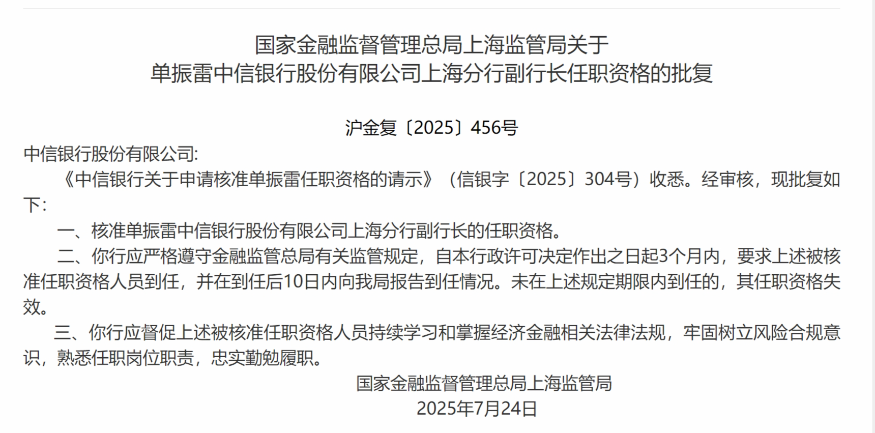 股份有限公司上海分行副行长任职资格的批复》,核准单振雷中信银行股份有限公司上海分行副行长的任职资格。