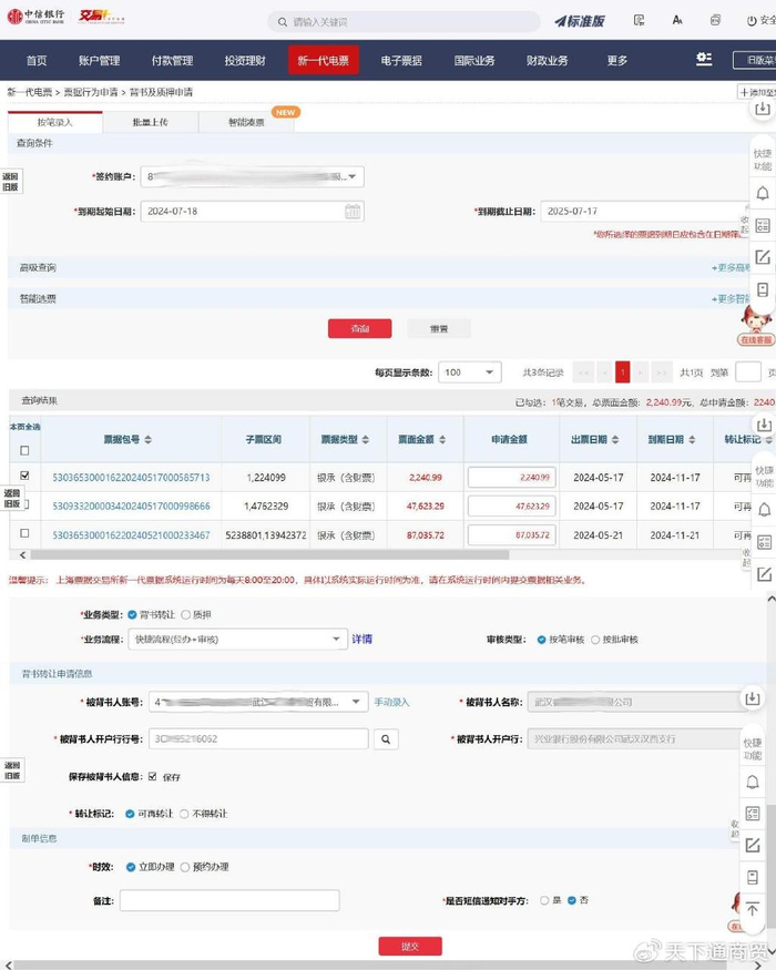接下来点击 新一代电票 - 票据行为申请 - 背书及质押申请,选择签约账户,再点查询,已持有在户的所有新一代票据,都会在列表中显示出来,选择需要背书的新一代票据,这里的申请金额,可以手动填写本张票面金额以内的任意金额,业务类型选择“背书转让”,业务流程选择“快捷流程(经办+审核),审核类型选择“按笔审核”,接下来输入被背书人账号、名称、开户行行号和开户行名称,转让标记选择“可再转让”,时效选择“立即办理”,再点“提交”,按提示完成经办操作。