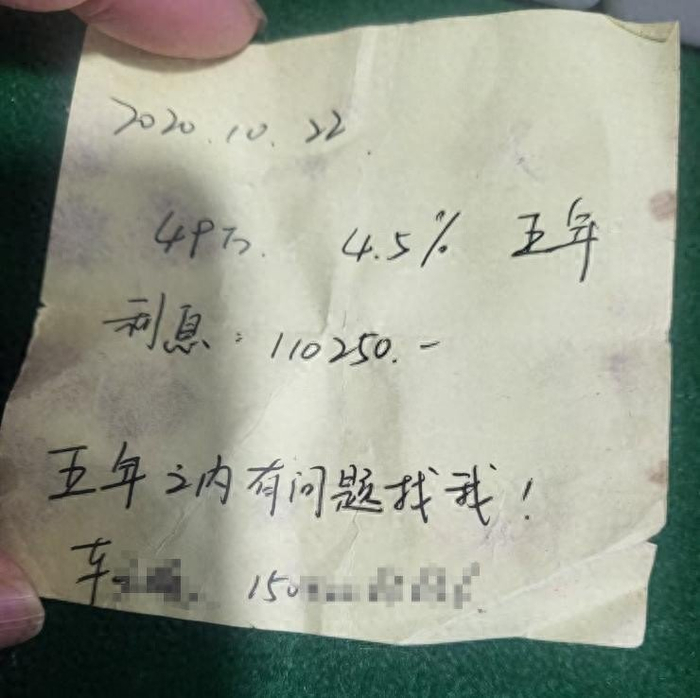 孙女士向记者透露,自己年龄较大且风险承受能力有限,当时本无意购买长期保险产品,但车某多次劝说,并以“4.5%年化收益”“存满5年稳赚利息”作为保证,甚至出具手写承诺纸条。纸条上不仅标注了利率计算方式,还写明了“五年之内有问题找我!”