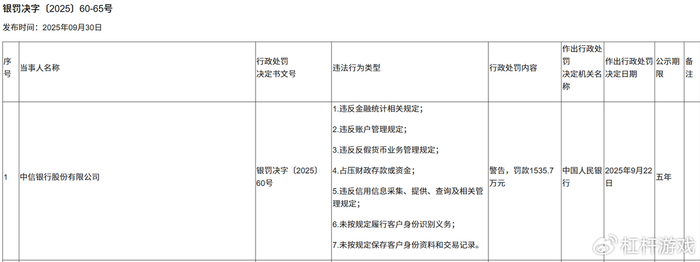 更值得注意的是,这只是中信银行在2025年收到的又一张罚单。