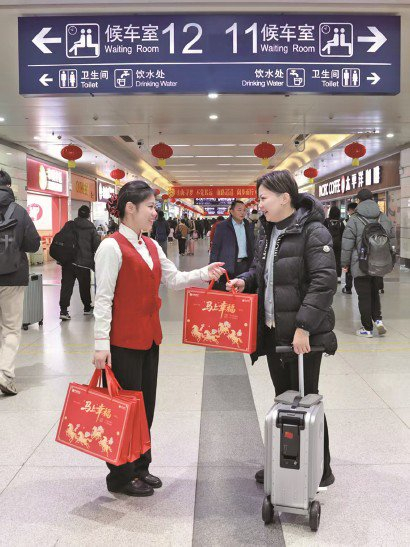 2月10日,中信银行上海分行工作人员在上海火车站内为春运旅客送上新春福袋。 余世佳 摄