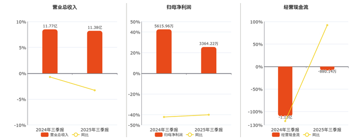 公司营业总收入为11.38亿元,在已披露的同业公司中排名第6,较去年同报告期营业总收入减少3872.43万元,同比较去年同期下降3.29%。归母净利润为3364.22万元,在已披露的同业公司中排名第6,较去年同报告期归母净利润减少2251.74万元,同比较去年同期下降40.10%。经营活动现金净流入为-880.14万元,在已披露的同业公司中排名第9,较去年同报告期经营活动现金净流入增加1.05亿元。