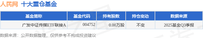 持有人民网最多的基金为广发中证传媒ETF联接A,目前规模为6.25亿元,最新净值0.9791(10月30日),较上一交易日下跌1.47%,近一年上涨27.7%。该基金现任基金经理为罗国庆。