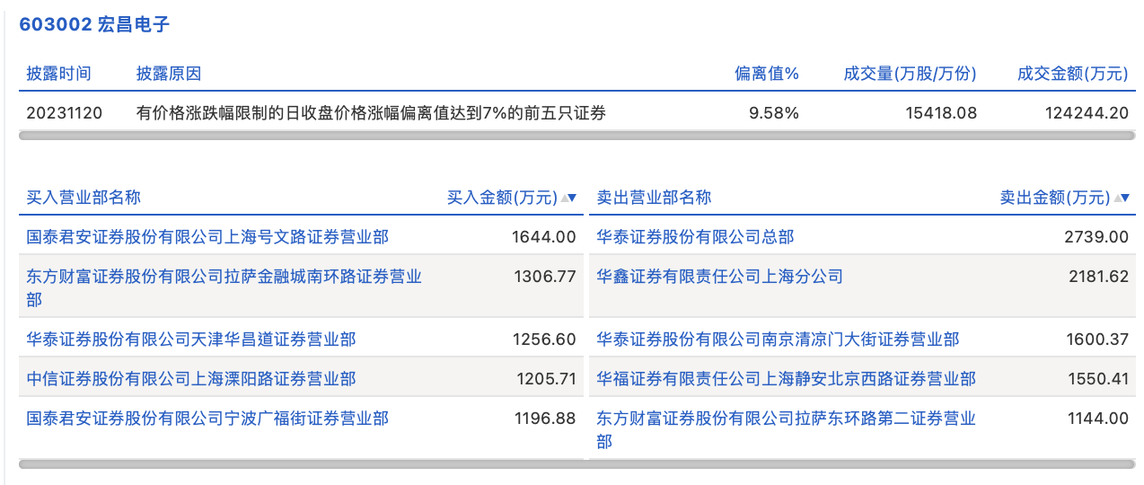 11月20日,宏昌电子今日涨停,龙虎榜数据显示,上榜营业部席位全天成交1.58亿元,占当日总成交金额比例为12.74%。其中,买入金额为6609.96万元,卖出金额为9215.39万元,合计净卖出2605.44万元。