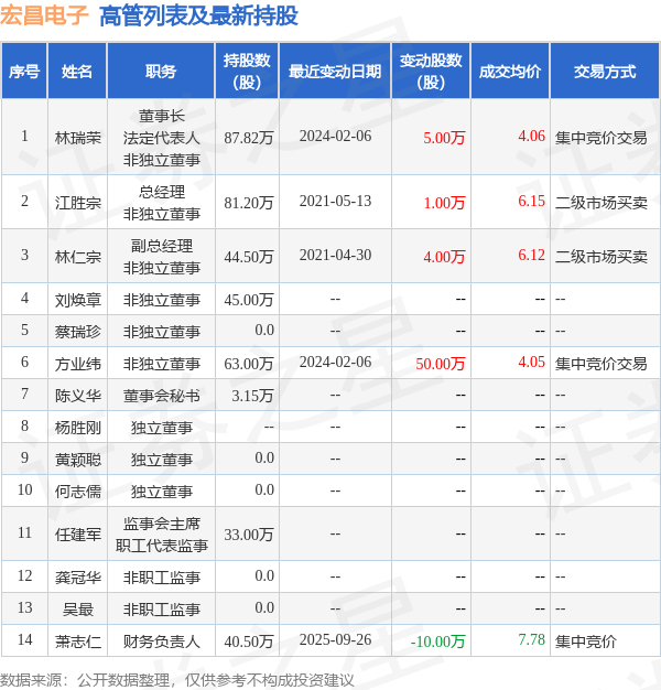 宏昌电子近半年内的董监高及核心技术人员增减持详情如下: