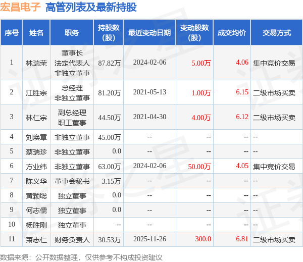 宏昌电子的高管列表及最新持股情况如下: