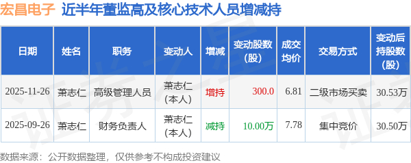 宏昌电子:11月26日高管萧志仁增持股份合计300股