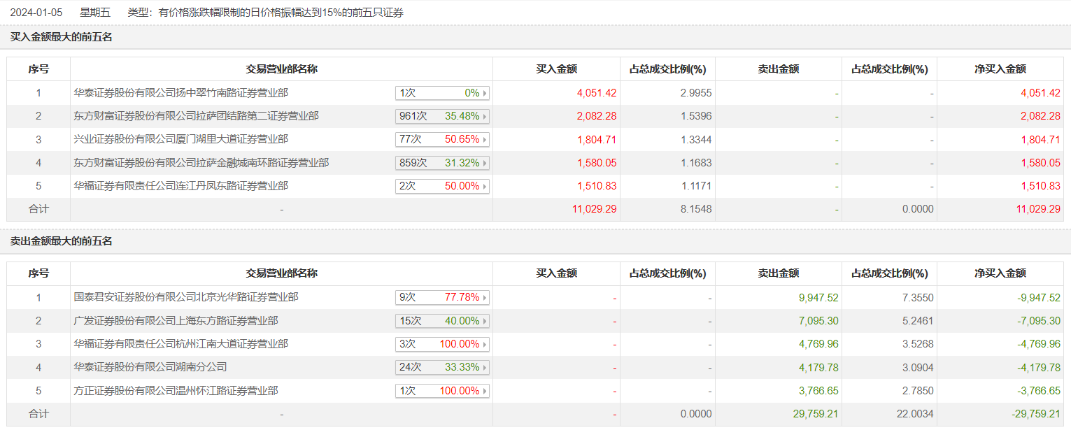 鼎龙科技1月5日跌停,全天换手率达58.6%,振幅达18.26%。龙虎榜数据显示,营业部席位合计净卖出1.87亿元。其中,国泰君安证券北京光华路证券营业部、广发证券上海东方路证券营业部分别卖出9947.52万元、7095.30万元;华泰证券扬中翠竹南路证券营业部、东方财富证券拉萨团结路第二证券营业部分别买入4051.42万元、2082.28万元。