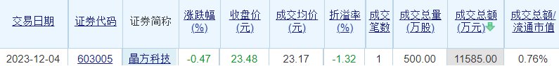 晶方科技昨日大宗交易成交1.16亿元 折价率1.32%