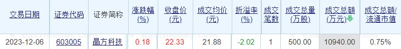 晶方科技昨日大宗交易折价成交500万股 成交额1.09亿元