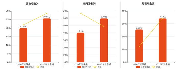 公司营业总收入为10.66亿元,较去年同报告期营业总收入增加2.36亿元,实现2年连续上涨,同比较去年同期上涨28.48%。归母净利润为2.74亿元,较去年同报告期归母净利润增加8928.76万元,实现2年连续上涨,同比较去年同期上涨48.40%。经营活动现金净流入为3.10亿元,较去年同报告期经营活动现金净流入增加7864.05万元,实现2年连续上涨,同比较去年同期上涨34.03%。