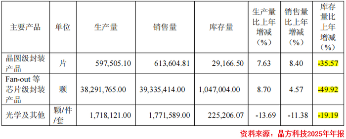 2025年,公司晶圆级封装产品和Fan-out等芯片级封装产品的库存量分别同比减少35.57%和49.92%。