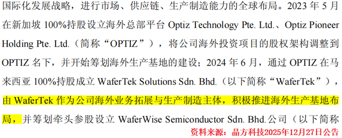 早在2023年,公司就在新加坡开始筹划海外生产基地建设。2025年12月,公司宣布其在马来西亚成立的WaferTek将作为海外业务拓展与生产制造主体。