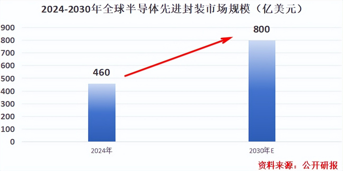 据机构调研,预计未来全球先进封装市场规模将由2024的460亿美元迅速膨胀到2030年的800亿美元。