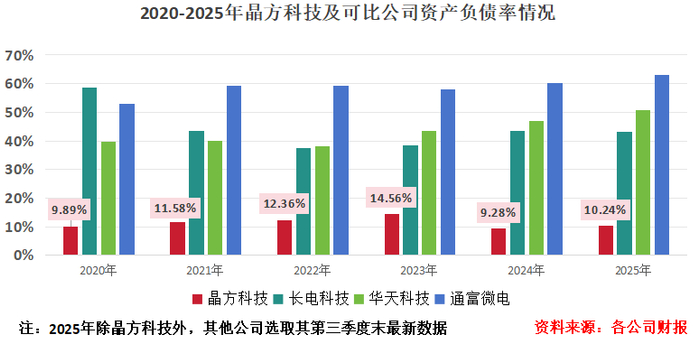 对比同行可比公司40%、50%的资产负债率水平,2025年末,晶方科技资产负债率仅为10.24%,财务底气十足。